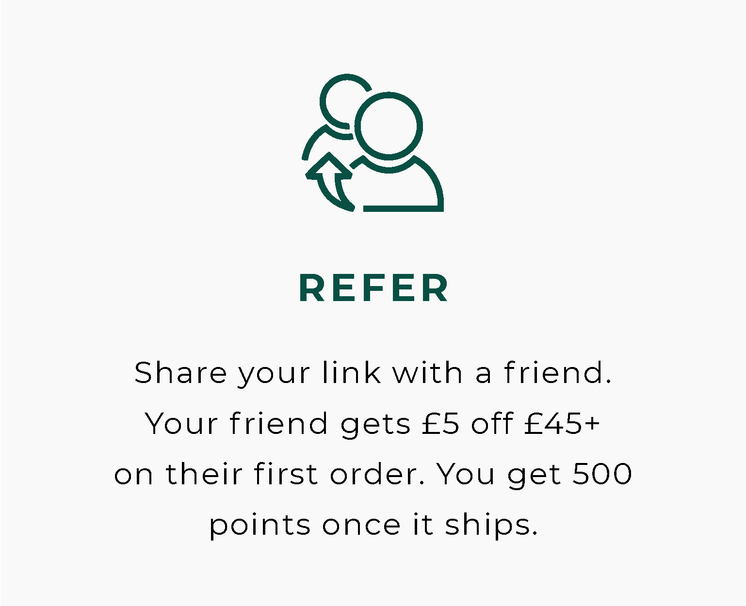 Share your unique referral link (you can find this in the rewards tab). Your friend gets £5 off their first order of £45+. Once their order ships, you get 500 points (£5).